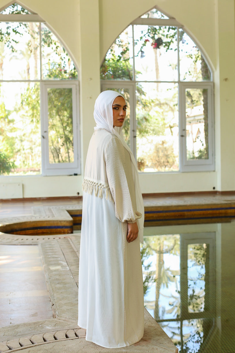 The Zainah Dress blends effortless grace with modern style . Designed in a chic beige and off-white mix, it features a flowing silhouette that flatters all body types, while the unique back details add a touch of intrigue and elegance, it offers both comfort and elegance, making it perfect for any occasion. A must-have dress for a refined, timeless look.